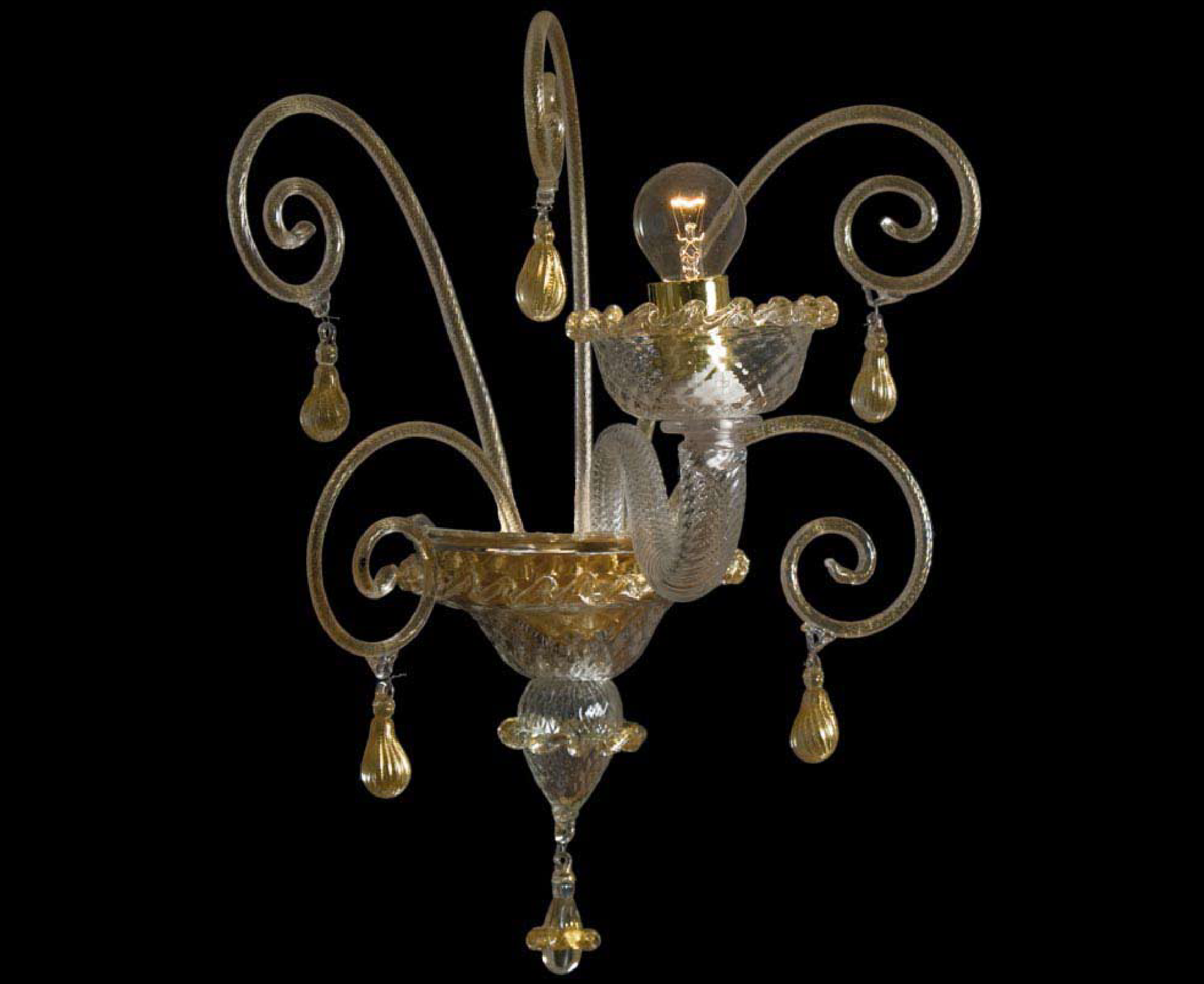 Il design dell’applique Vivarini Oro richiama lo stile classico delle applique veneziane decorative, ma la leggerezza del vetro trasparente le rende adatte anche a contesti moderni. È una soluzione ideale per chi cerca un’applique da parete in vetro di Murano che non sia solo una fonte di illuminazione, ma un vero elemento decorativo.