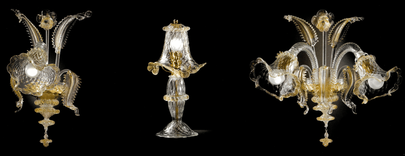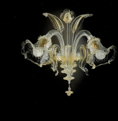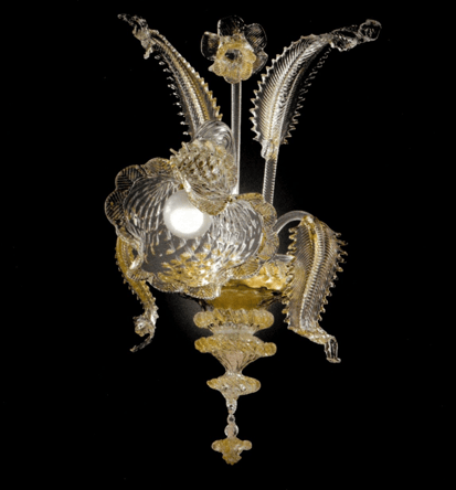 Veneziano Originale è il nome di queste appliques. Sono lampade da parete in vetro di Murano trasparenti con oro 24 Kt coordinate ai lampadari Veneziano originale