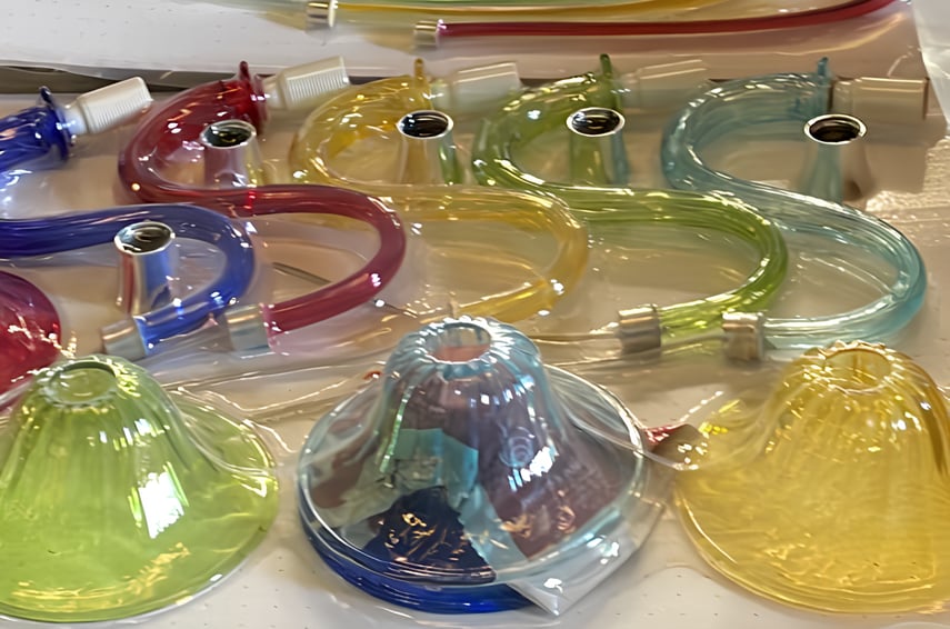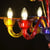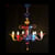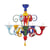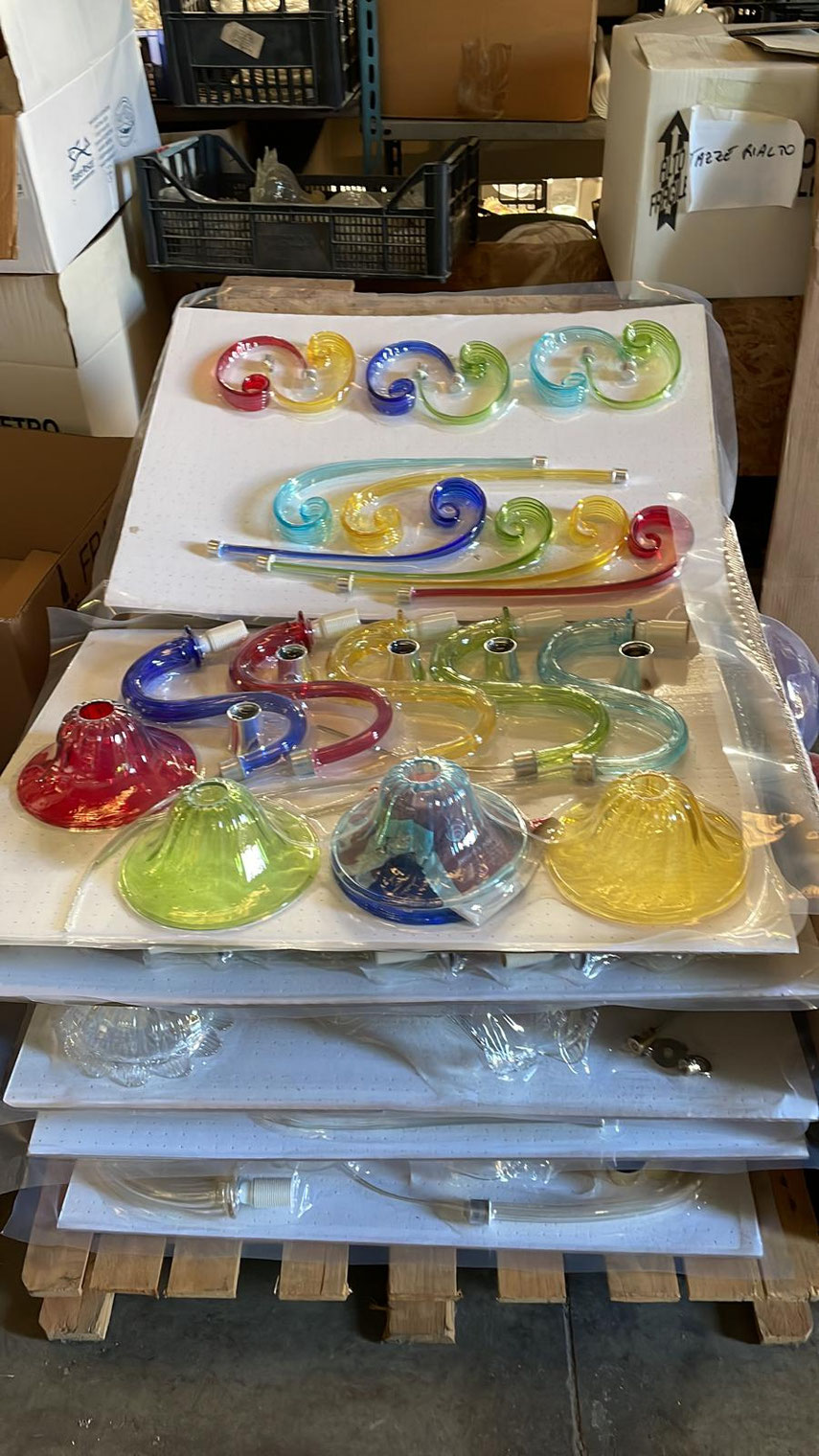 lampadario in vetro soffiato di murano moderno colorato con le luci rivolte verso l'alto.