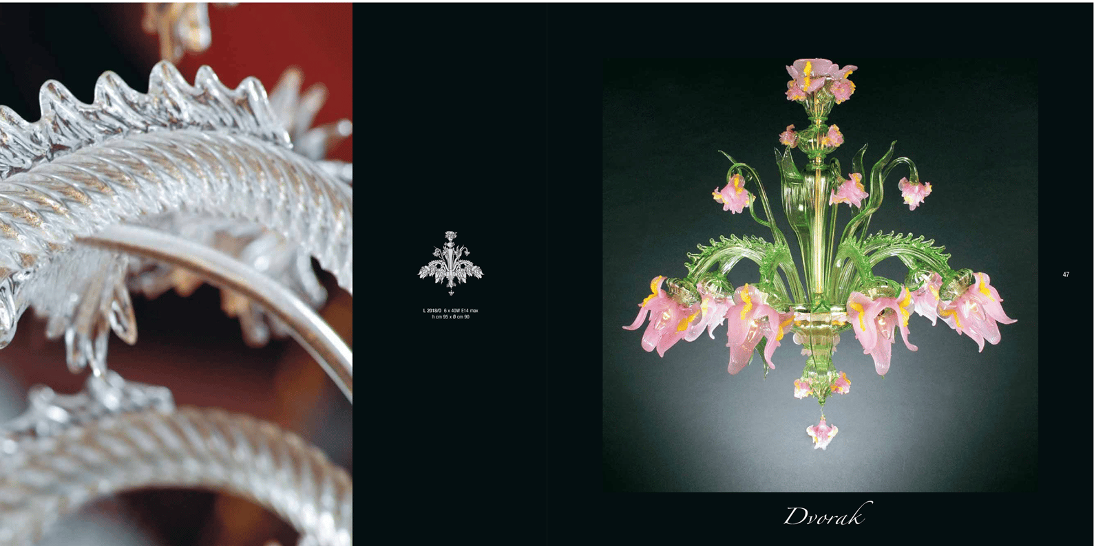 Il lampadario Dvorak appartiene alla tradizione dei lampadari di Murano con braccia modello secolo. La struttura in vetro soffiato valorizza il corpo verde, mentre le coppe a bocciolo e i dettagli in pasta rosa e giallo richiedono maestria e tempi di lavorazione elevati, per un risultato scenografico e raffinato.