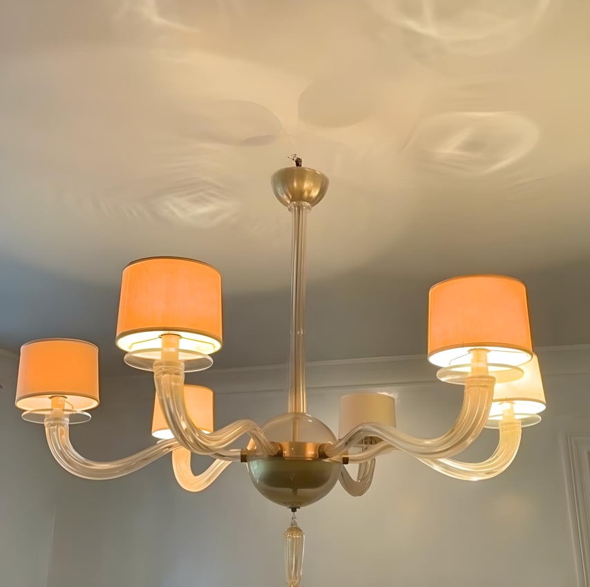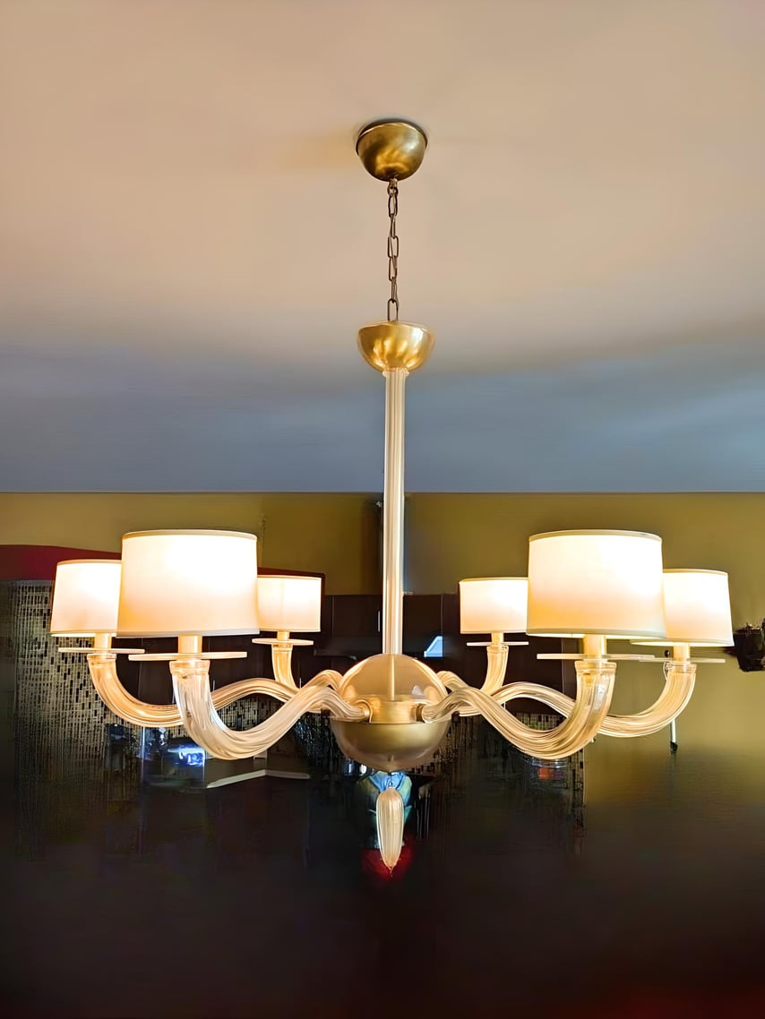 Porta in casa l’eleganza senza tempo del vetro di Murano con questo straordinario lampadario a 6 luci. Ogni braccio in vetro soffiato, curvato a mano con maestria, sorregge un paralume cilindrico rivestito in tessuto color avorio chiaro con bordo dorato, creando un perfetto equilibrio tra classico e moderno.