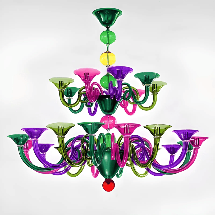 Liv serie di lampadari monumentali in vetro soffiato di Murano moderni con forme lineari e sinuose con colori brillanti quali elementi caratterizzanti.